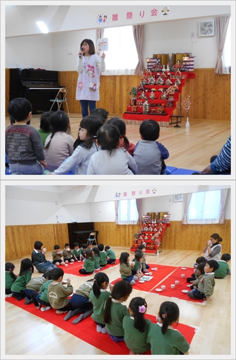 雛祭りの由来と雛人形の名前を教えてもらい、興味を持って聞いていました。