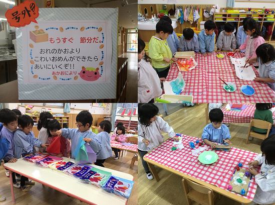 手作りのお面と升で、赤鬼さんをやっつけよう!