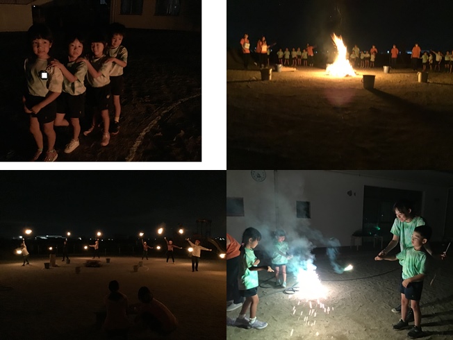 園長先生による火のお話を聞いた後は、大好きな鬼滅の刃の曲に合わせて行った先生たちによるトーチ、キャンプファイヤーを囲んでフォークダンスと集団ゲーム。最後は、花火大会!!時間はすっかり20時30分・・・。最後は、お迎えにみえた保護者の方と一緒にキャンドルロードを歩きました。年長最後の夏を満喫した子ども達でした。