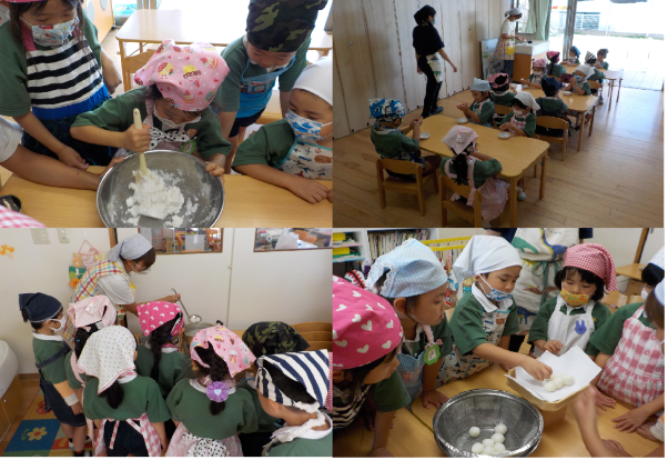 林檎組さんが、みんなを代表してお供え用のお月見団子を作りました。上新粉にお湯を入れて、一人ずつ混ぜた後、一人1個生地を丸めながら「ぷにゅぷにゅしてるよ。」「見てみて~~~。丸くなったよ。」とニコニコ笑っていました。それを、ゆでて冷たくなったお団子を飾ると完成!!「お団子は、15個なんだよ。」と給食室の先生に教えてもらうと、「なんで?もっと、作りたい!!」「あ!!、十五夜だからだ!!」と新しいことも知った林檎さんは、葡萄さんや蜜柑さんにも「十五夜だから、15個なんだよ。」と得意気に教えてあげていました。