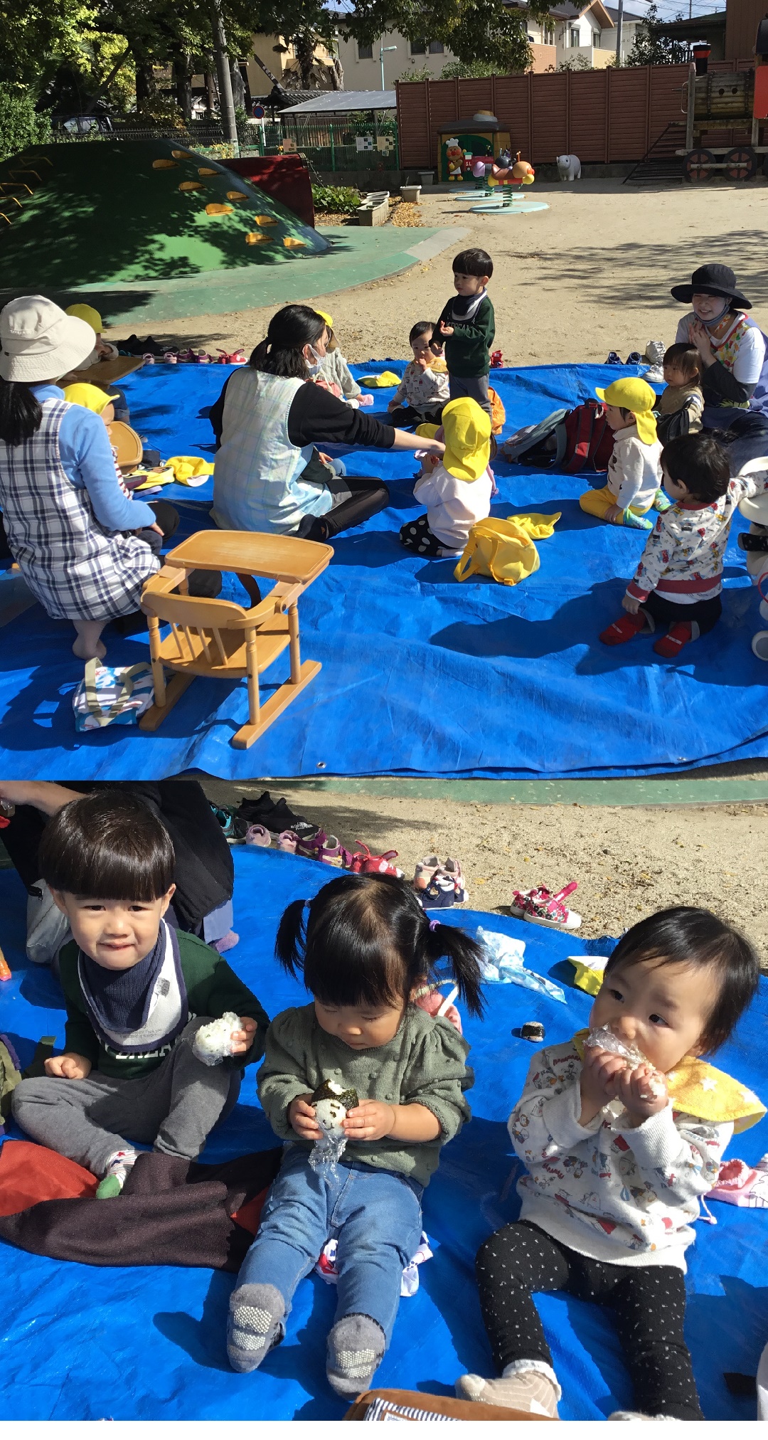 園庭でおにぎりを食べ「おいしいねー!」と
