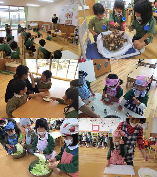 野菜のお腹のお話では、蓮根の穴から覗いて見たり、「ねぎのお腹くるくるしてる~」と触ったりして野菜と仲良くなった子ども達でした。