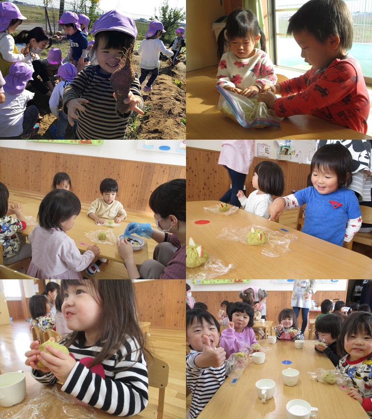 今日は薔薇組(2歳児クラス)のみんなで、畑で掘った薩摩芋を使ったクッキング!