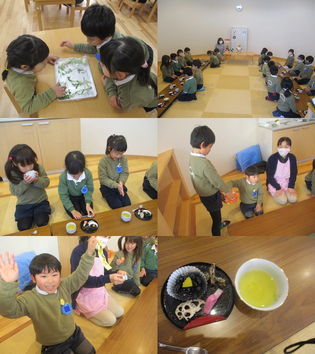 この日はちょうど七草の日でもあり、七草の名前や効能、おせちに込められた願いを聞いて、おやつの時間に和室で日本の和の雰囲気の中おせちと七草粥を頂きました。