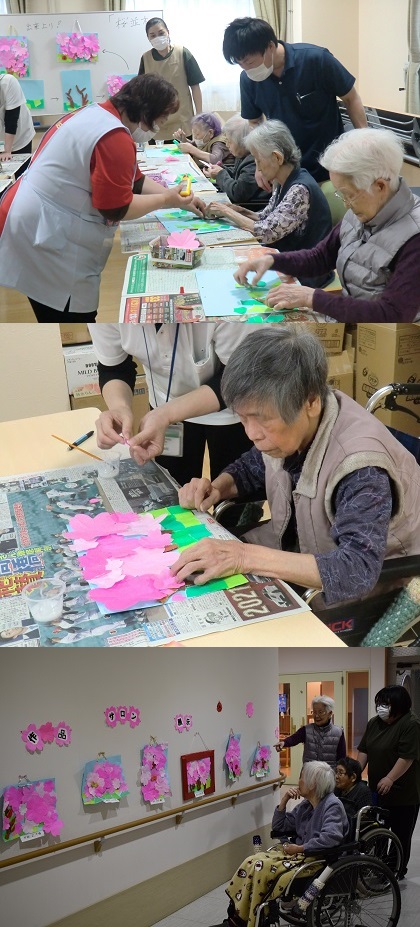 桜の花びらや木の幹、蝶々やてんとう虫を楽しく貼って頂きました。