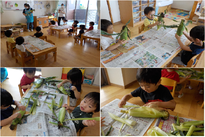 8月18日に檸檬組(2歳児)でとうもろこしの皮むき体験を行いました。