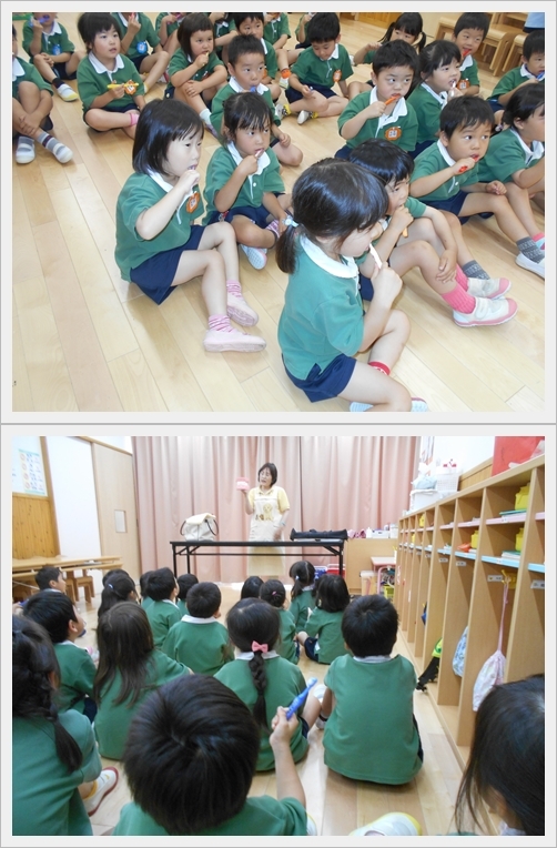 向日葵組と紫陽花組のみんなが、保健師さんによる歯科指導を受けました。