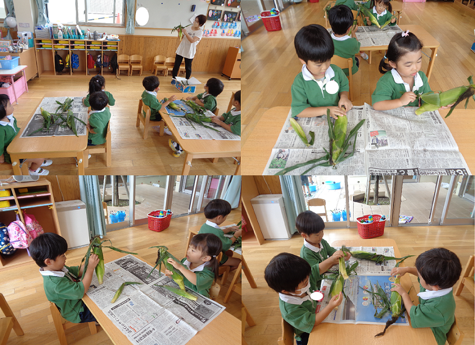先日桜組の子ども達が、おやつで食べる”とうもろこし”の皮むきをしました。