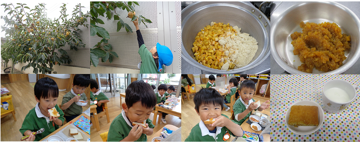 今年は、園庭の柿の木に実がたくさんつき豊作となりました。実った柿は、子ども達と収穫をして給食室でジャムにしてもらいました。砂糖とレモン汁を加えた甘酸っぱいジャムです。