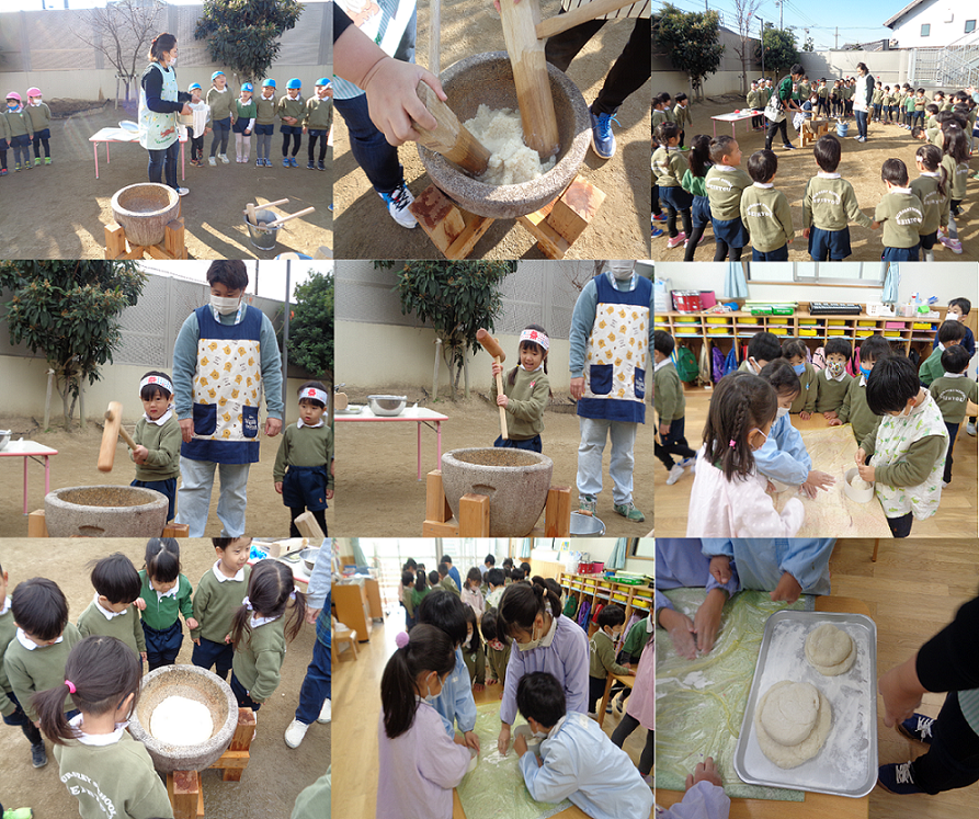 まずは先生達の出番です。子ども達の「よいしょ!よいしょ!」の掛け声に乗り、ペッタンペッタンといい音が響いていました。