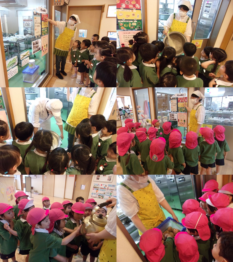 他にもいろいろなものを見せてもらい、いつもどのように給食が作られているのか知った桜・向日葵組さんからは、「給食いっぱい食べるね。」「野菜嫌いだけど、ちょっと頑張ろうかな。」「いつも給食作ってくれてありがとう!」という声が聞こえてきました。