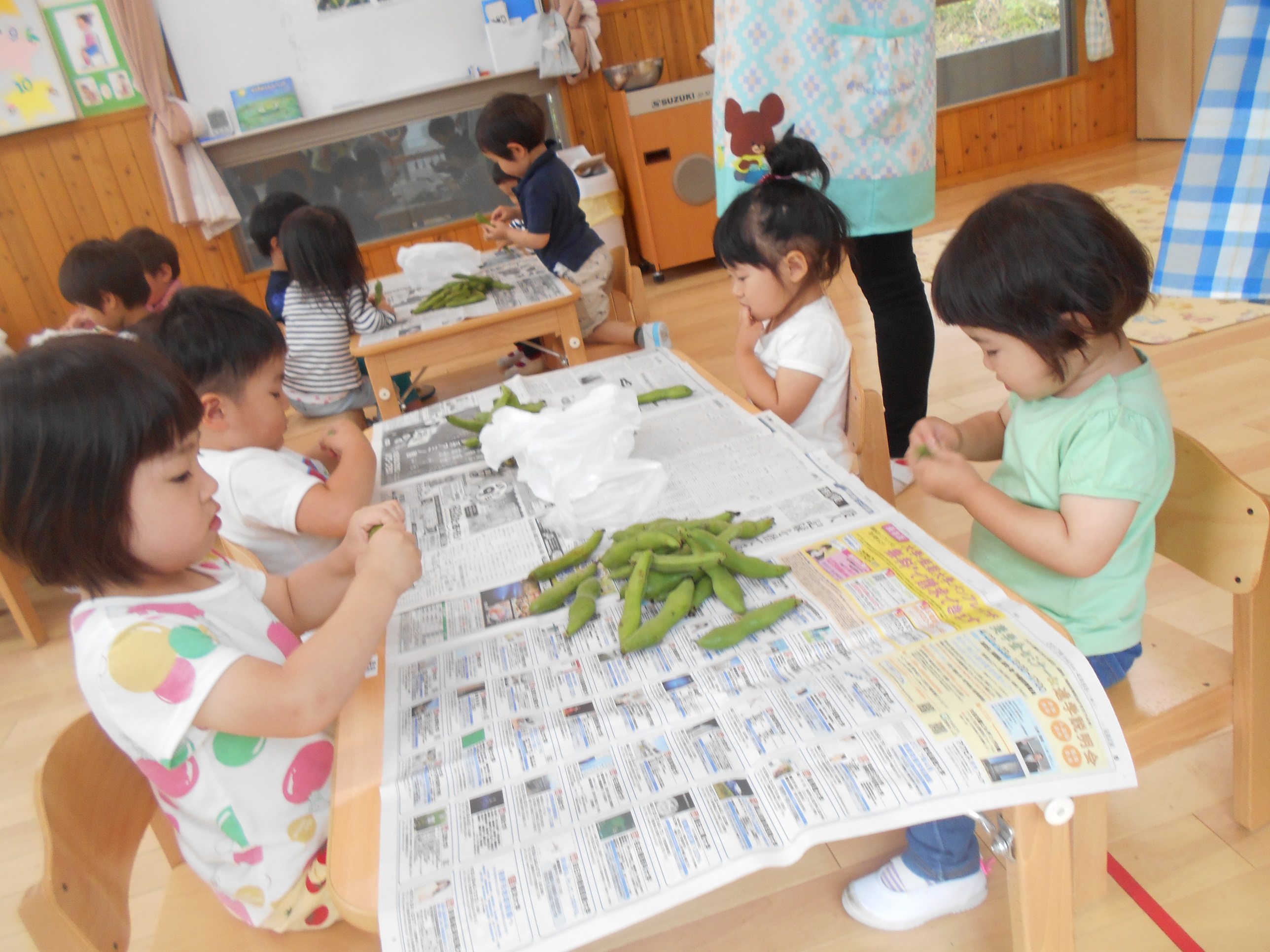 おやつに出る空豆の皮むきのお手伝いをしてくれました。