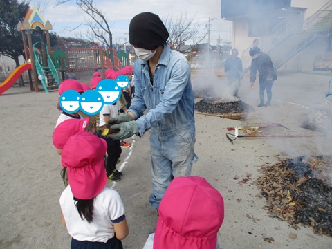 幼稚園の園庭で焚火をしました。