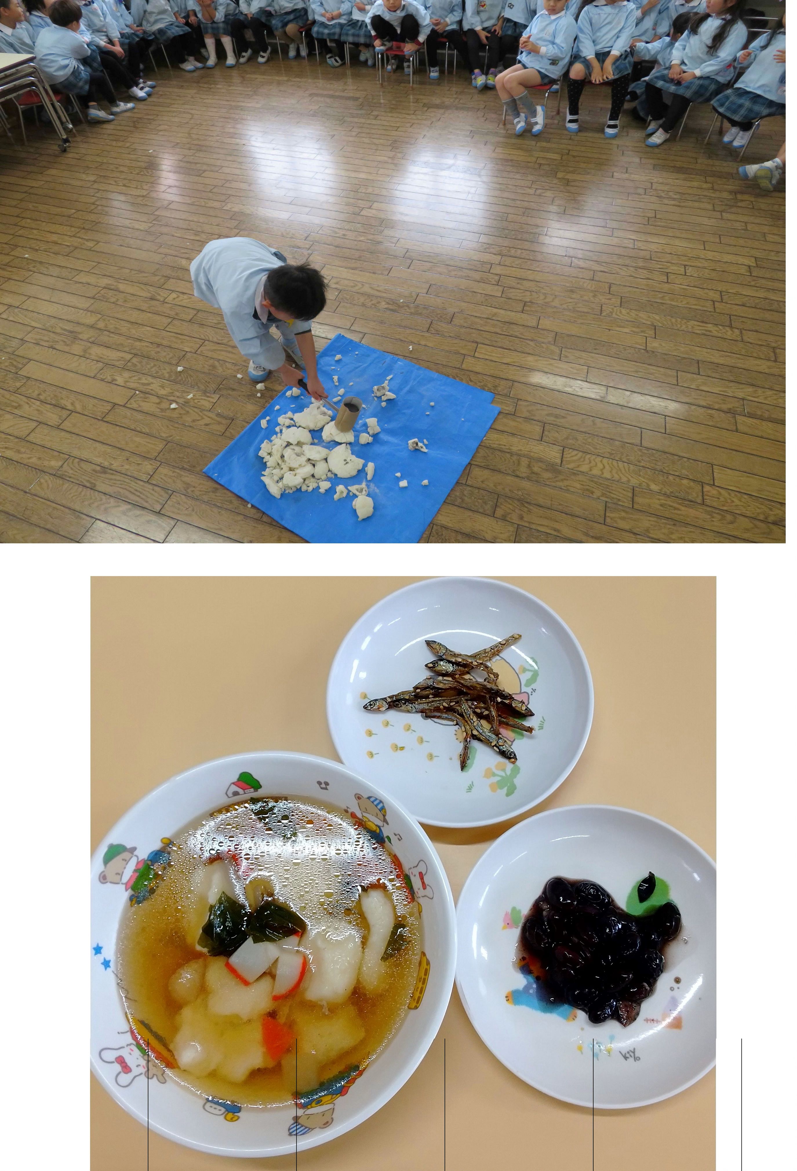 12月に子どもたちが作った鏡餅の鏡開きをしました。