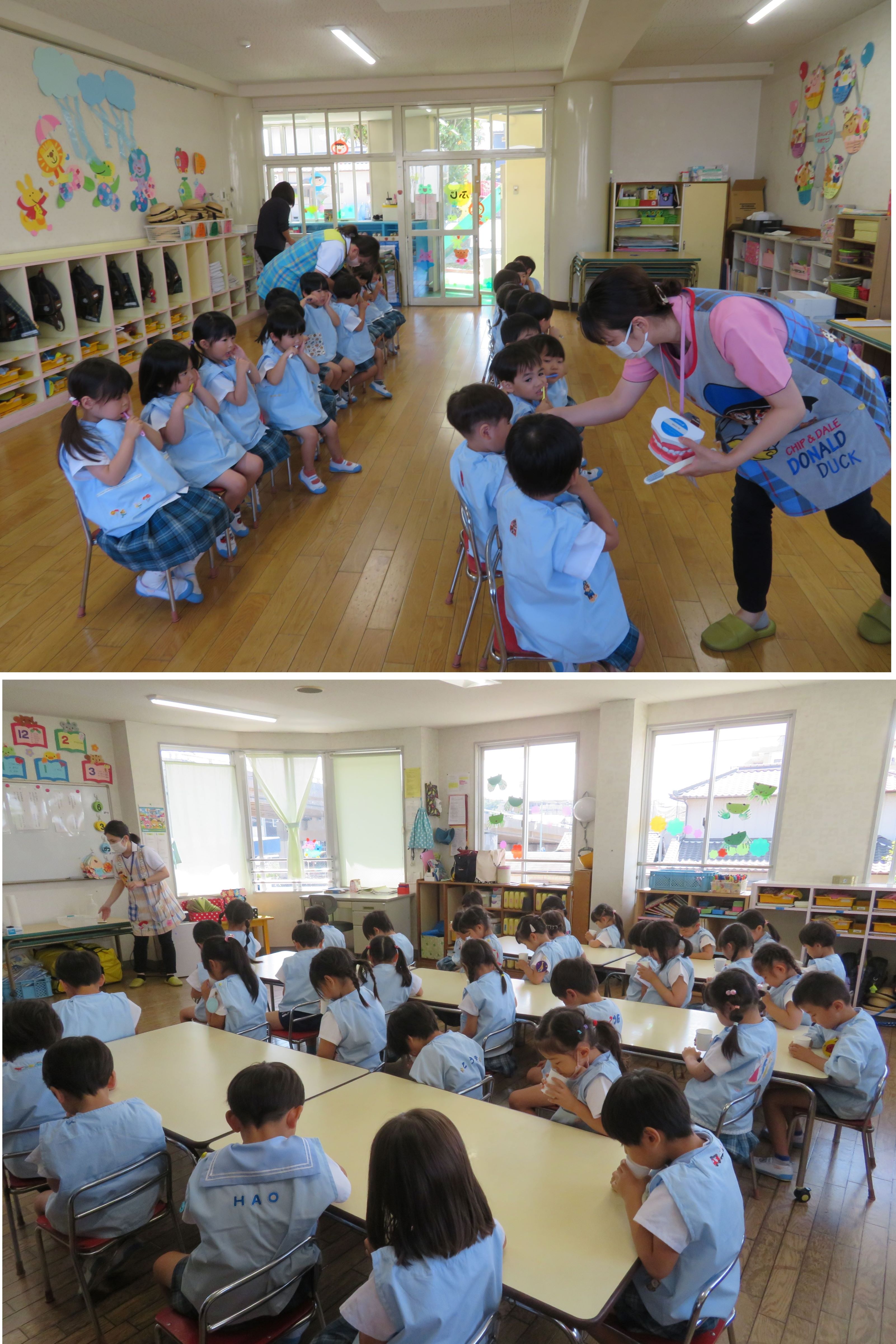 年長組は歯みがき指導とフッ化物洗口体験をしました。
