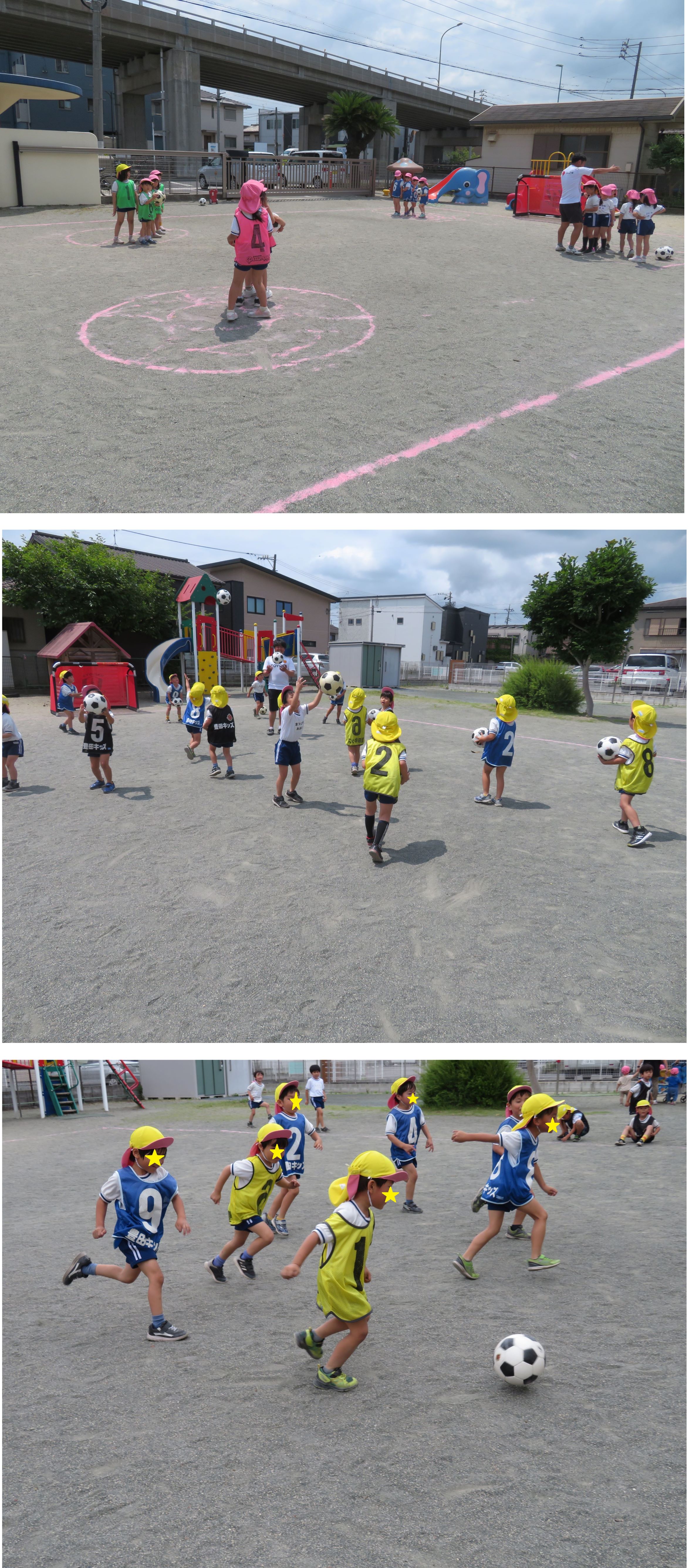 去年は雨天のため、遊戯室でのサッカー教室だったので、今年は園庭で行うことができ、子どもたちは大喜びでした。
