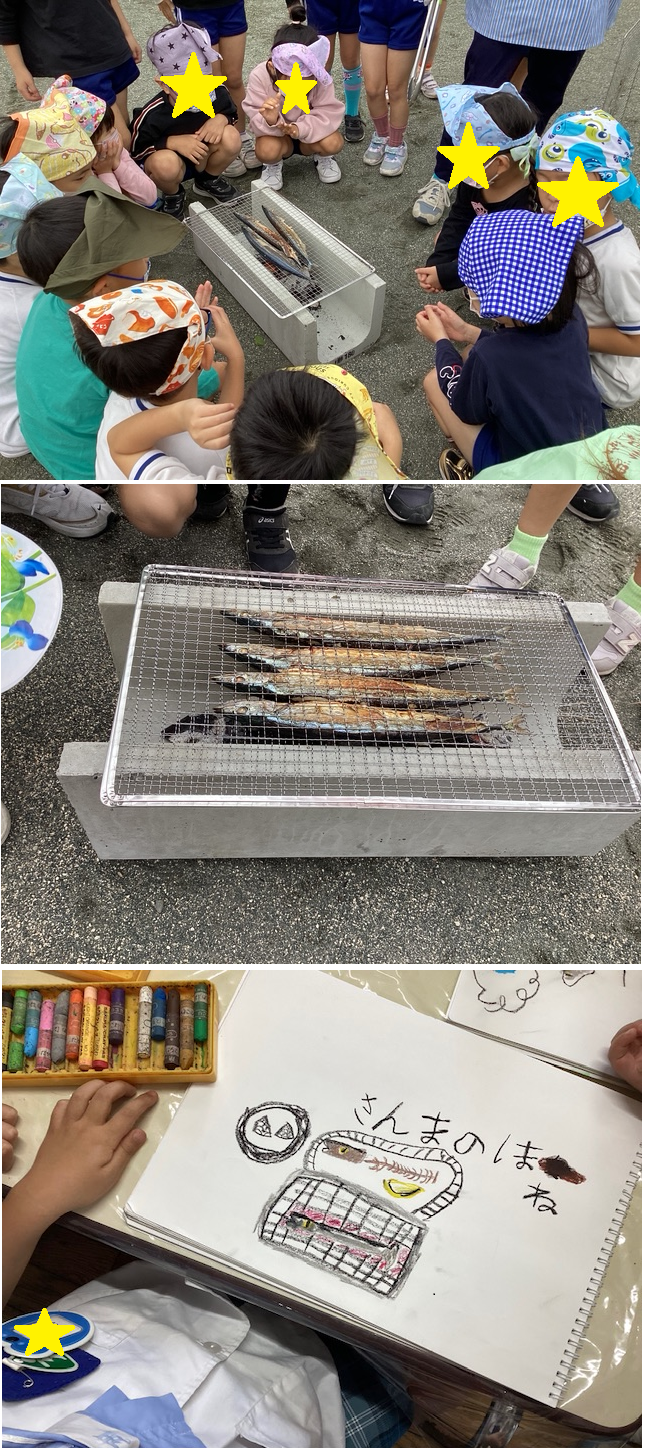 秋刀魚が焼けてくるとおいしそうな匂いに子どもたちの顔がにっこりしました。
