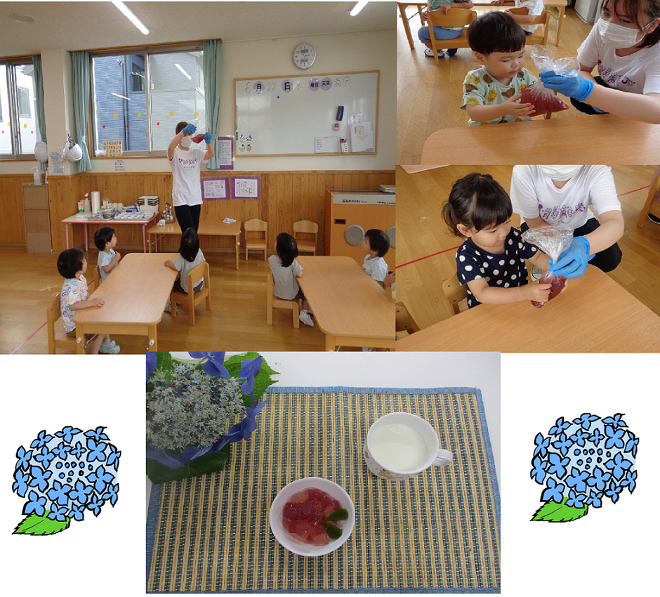 お皿に盛られた一口大のゼリーの上に、子ども達がクラッシュしたゼリーを乗せ、さらに幼児クラスの子ども達は自分で葉っぱに見立てた抹茶のゼリーを乗せました。見事な紫陽花の花が咲き完成です!