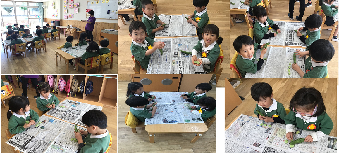 今日は向日葵組の子ども達におやつで食べるそら豆を、鞘から取り出してもらいました。