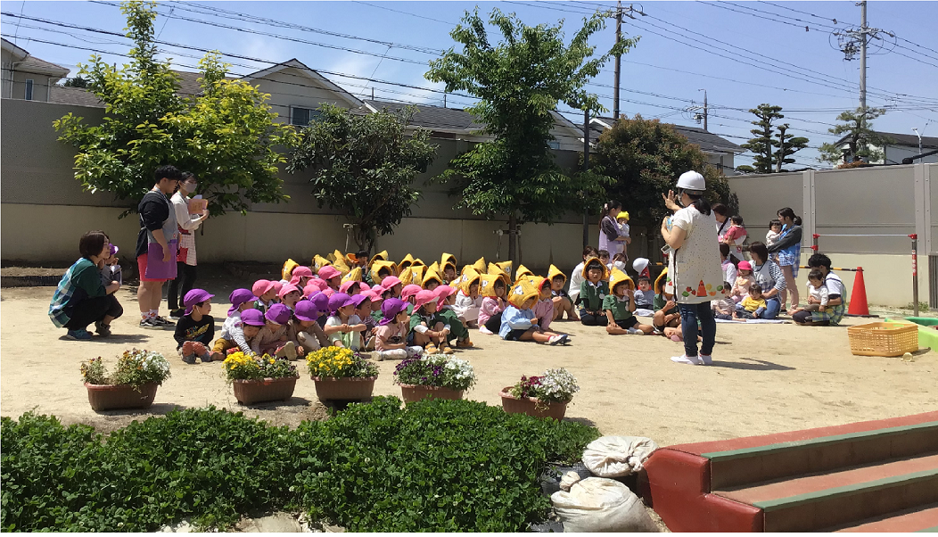 火事が起こったことを想定して避難訓練を行いました。訓練を伝える放送が流れると、先生の話をよく聞いて行動することが出来ました。幼児クラスの子ども達は「口をおさえないと!」と教え合うことが出来、煙を吸わないイメージもしっかり持てていました。「お・か・し・も・ち」のお約束も教えてもらい、真剣に聞いて覚えていた子ども達でした。