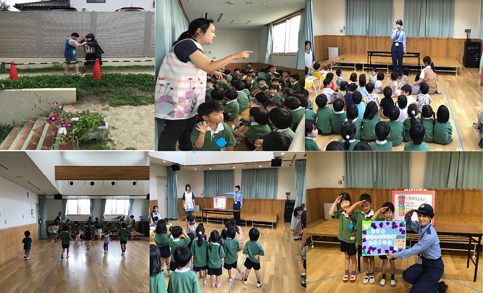 お巡りさんの立ち合いのもと、防犯訓練を行いました。不審者が出た時の避難の合言葉を「うさぎが来たから見に行こう」に決め、日頃から練習している子ども達。いざ訓練が始まって合言葉を聞いても、焦ることなく落ち着いて避難することが出来ました。お巡りさんからも『はなまる』をもらいましたよ。