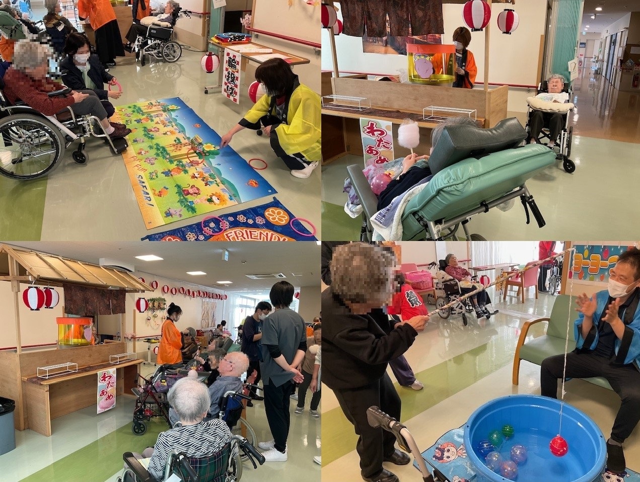 入居者様には、わたあめ、たこ焼き、ヨーヨー釣り、輪投げ、あひるすくいを順に楽しんでいただきました。