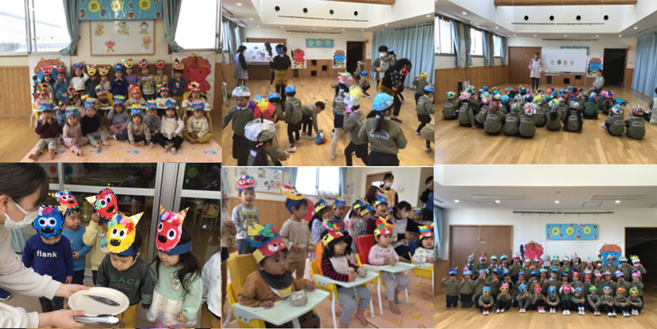 幼児クラスでは、節分の由来を聞きました。節分のことや鰯、柊、恵方巻、豆について知ることが出来ました。 赤鬼と青鬼が登場すると、大きな声で「鬼は外~福は内~!!」と3クラス力を合わせて、鬼を退治することが出来ました。 最後はみんなで鬼のお面を被って記念撮影!