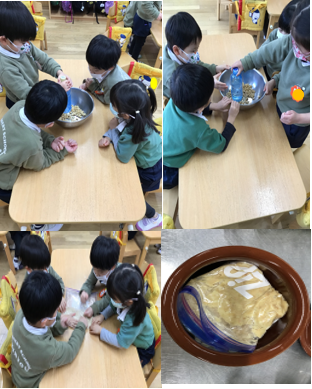 先日の豚汁会で紫陽花組の子ども達が作った味噌を食べて「美味しかった!」と言っていた子ども達は今度は自分達が美味しい味噌を作るんだ!という意気込みで楽しそうに作っていました。壺に入れる際には「美味しくなーれ」とお願いをしました。