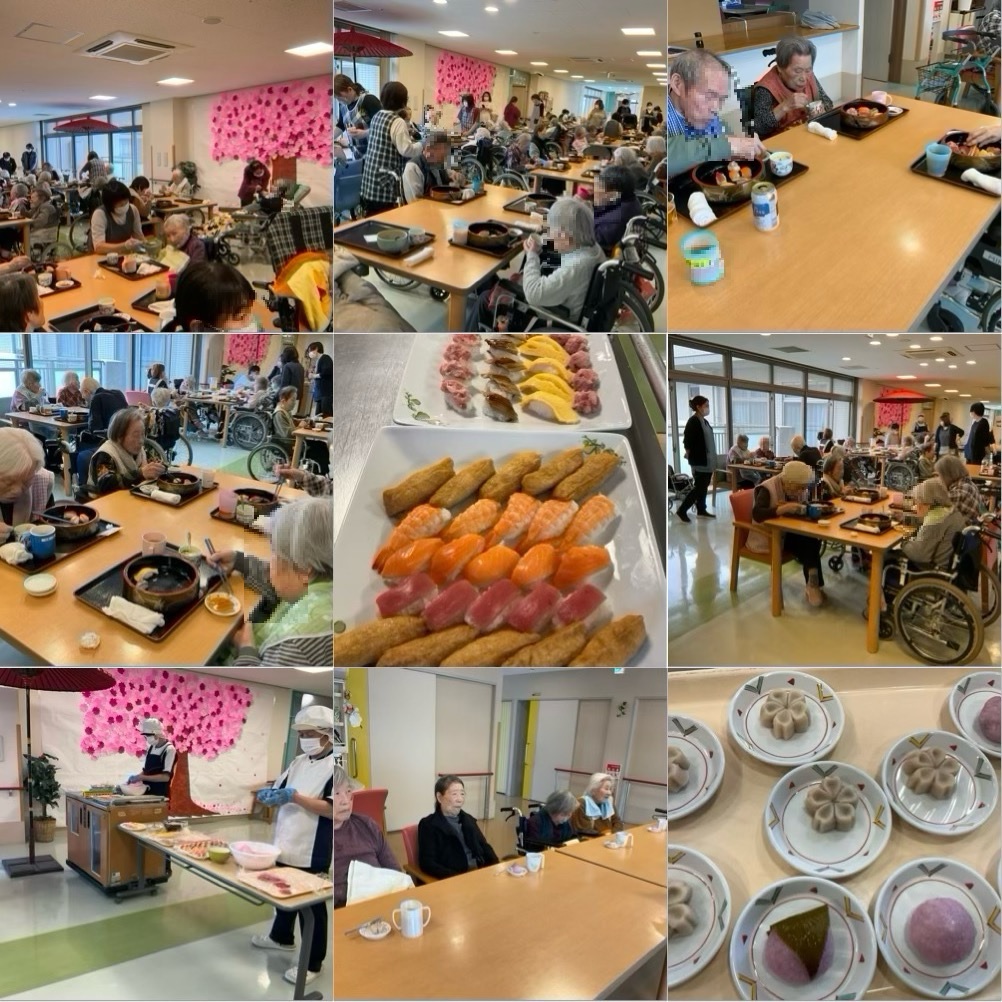 春のお節句のお祝いとして、お寿司や桜餅等をご提供した際の様子です。