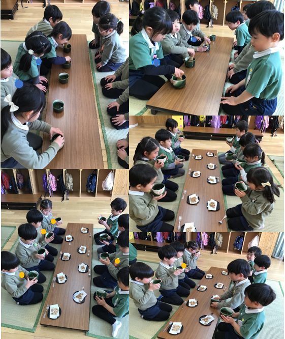 先日、年長さんが年中さんにお抹茶を振る舞いました。