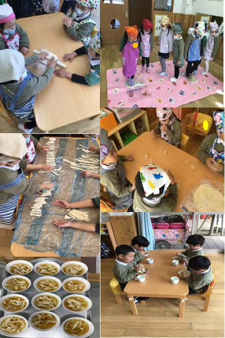 年中組さんが大好きな絵本『うどん、できた!』に出てくる『うどん』を実際に作りました。
