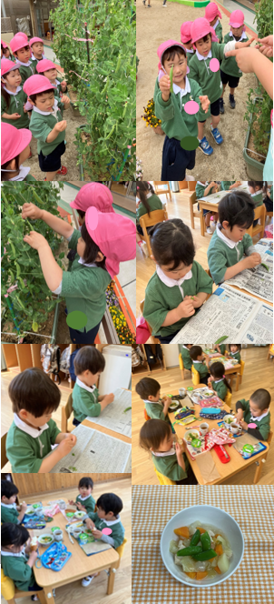 年少組の子ども達が、園庭でスナップえんどうを収穫しました。
