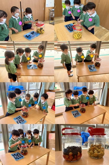 子ども達からは「色が変わったね!」「見た事ある梅干しみたいになってきたよ。」等、変化を感じる声が聞こえてきました。