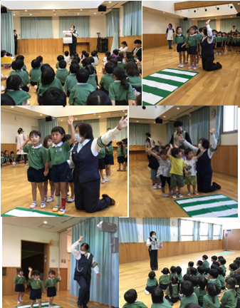 今日は緑区の交通指導員さんが保育園に来てくださり、子ども達に交通ルールや横断歩道の渡り方について教えてくれました。