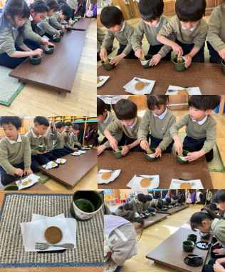 子ども達はフォークを使い、「ちょっと崩れたけど、切れたよ」「きれいに切れた!」と言いながら上手に切って、お抹茶と交互にいただきました。