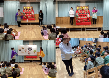 出し物では、お内裏様とお雛様に扮した保育士が劇クイズを行い、桃の花を飾る事、菱餅の色、お祝い食など雛祭りについて楽しく知る事が出来ました。