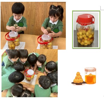 先日幼児クラスで作った『はちみつ梅』から梅酢があがってきたので、今回は年中クラスのみんなが残りのはちみつを瓶に入れる作業を手伝ってくれました。