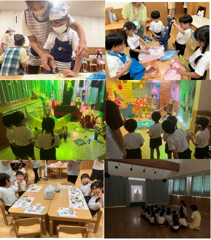 キャンプファイヤーやトーチを見て驚きいっぱいの子ども達、系列園の年長組と一緒にダンスやゲームを楽しみました。