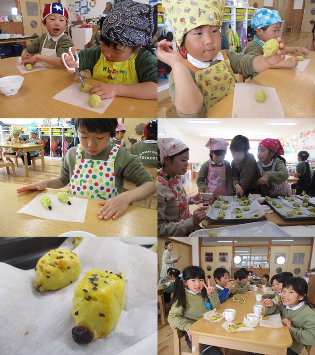 向日葵組の時にも一度作ったスイートポテトですが、去年は混ぜてカップに入れるだけだったのが一年経ち、ハサミを使ってこんなに細かい作業も出来るようになりましたよ。