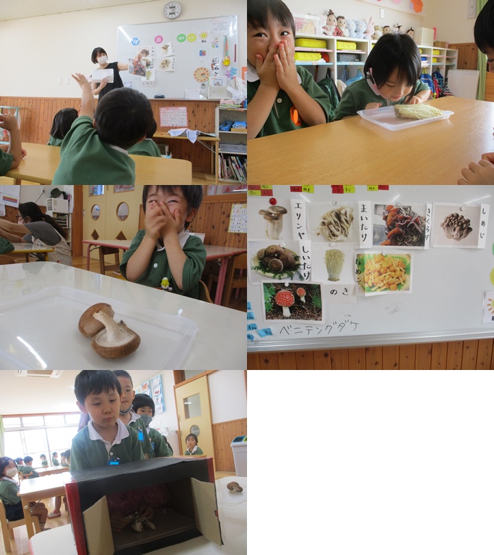 年中・年長組でいろんな種類のきのこを見て、名前を当ててもらいました!