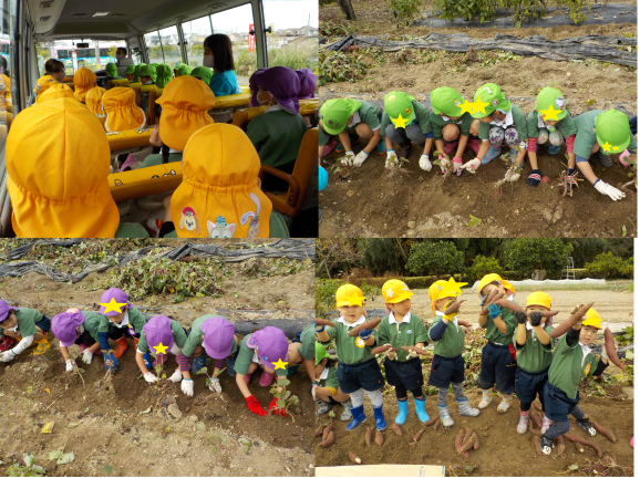 芋掘りに出かけました。バスに乗るとみんな、ウキウキソワソワ。あっという間に、相生山オアシスに到着!バスを降りてから、畑までの道のりが少し遠いけど、そんなの全然気にならないほどのスピードで歩いていました。
