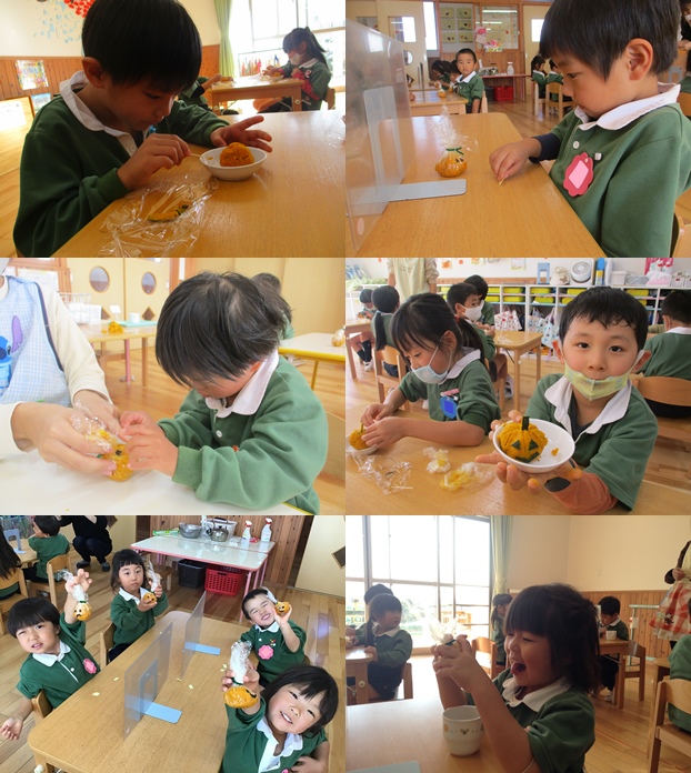 年中・年少さんはシールとモールを使って、年長さんは南瓜の皮を使ってジャック・オー・ランタンの形のおやつを作りました。