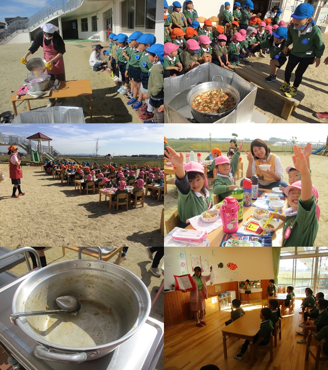年長組さんは先にお外へ出て出汁の味見をしました。