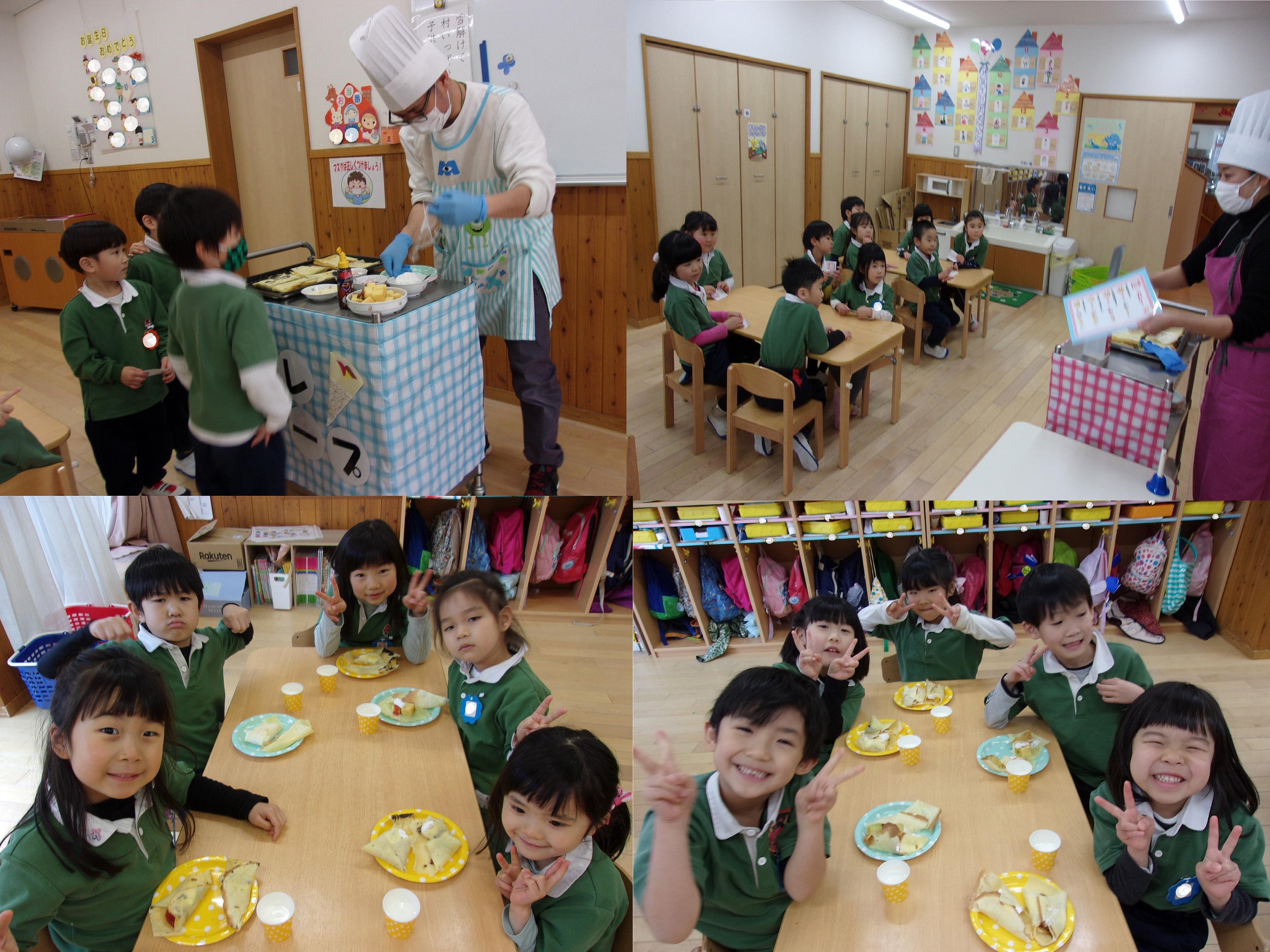 発表会ごっこの後のおやつは♪チリチリ~ン♪と、ベルの音と甘い匂いと一緒にクレープ屋さんがお部屋にやってきました。「わ~!クレープ屋さんだ!」「やった!!」「うれしい!!!」「どれにしよう」等子ども達は大喜び。「チョコバナナください」「ツナチーズください」等メニューを見て注文していました。中には「どれも好きで選べない!」という子も。クレープは大人気であっという間の完食!発表会に向けてさらに元気もりもりになった子ども達です!