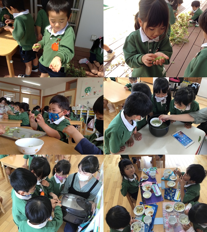 さっそく向日葵組さんで収穫し、豆ごはんを作りました。
