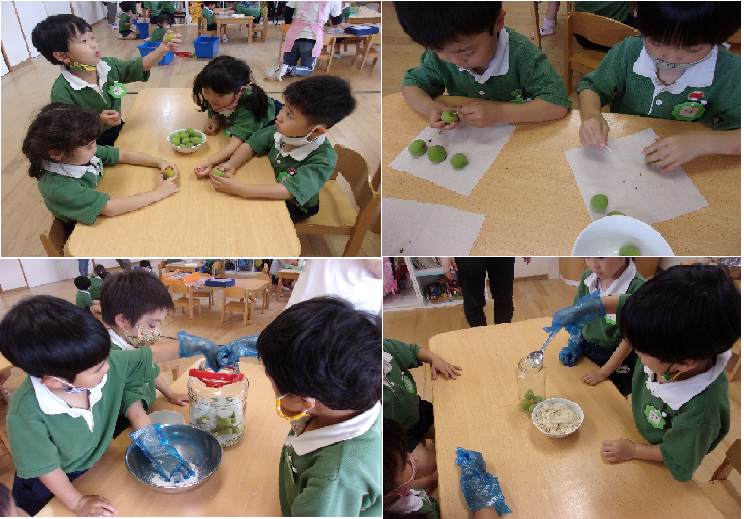 6月16日に林檎組(年長)が梅シロップを作りました。梅を手に持つと「梅の匂いするー!!」と嬉しそうな子ども達!シロップ作りの作業では爪楊枝で梅のへたを取り、梅と氷砂糖を容器に交互に入れていきました。作業が始まると楽しみながらも真剣に行っていました!!また、味の違いを見るために三温糖を使ったシロップも作りました。どんな味のシロップになるか楽しみですね♪