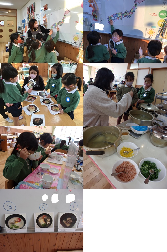 たくさんのお雑煮を見て、【どんな味かな?】といろいろ想像し、食への関心、食べたい気持ちが膨らんだ子ども達。お家の人とも全国お雑煮マップを見ながら「どれが一番美味しいかな?」「これお家で作って!」と楽しそうに話していました。