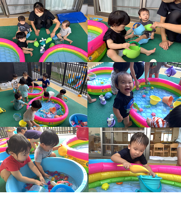 先日乳児組の子ども達が今年初めての水遊びを行いました。