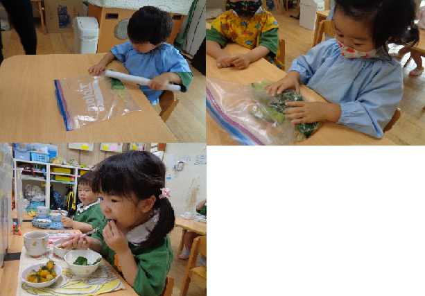 先日、蜜柑組(年少)の子ども達が園の畑で収穫したきゅうりで叩ききゅうりを作りました。