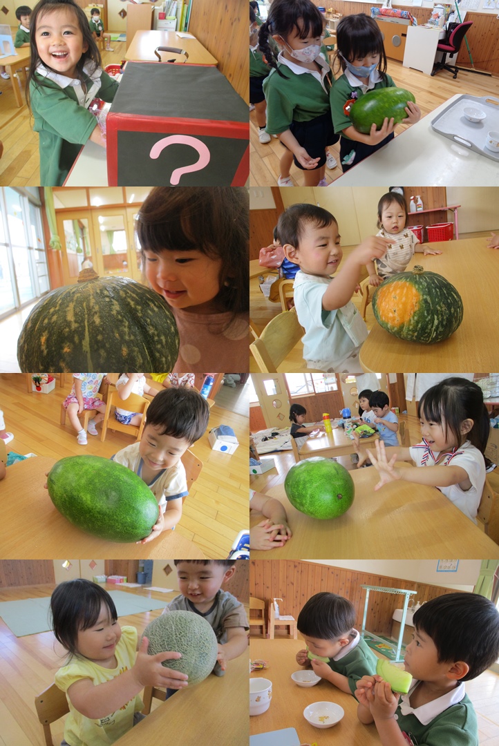 幼児クラスでは、はてなボックスで中身を当てるゲームが大人気!大きな冬瓜は持ち上げてお友達と力比べ☆